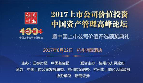 2017年8月22日,由证券时报社、中国基金报社主办,杭州市人民政府联合主办,中国上市公司发展联盟、杭州市金融办、杭州市上城区人民政府承办的“2017上市公司价值投资·中国资产管理高峰论坛暨中国上市公司价值评选颁奖典礼”在杭州市洲际酒店举行。