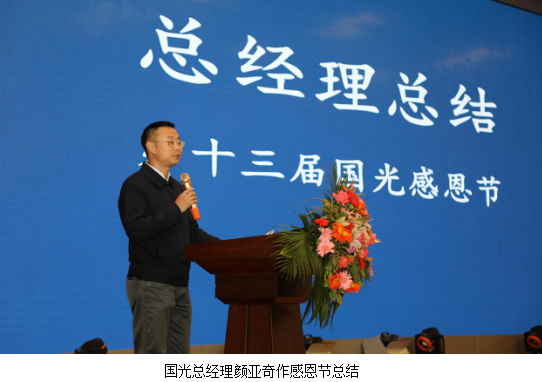 国光总经理颜亚奇作了感恩节总结,表示:“一个真正爱护员工的企业,会对员工的健康、家庭、子女各方面进行关心,此次我们扩展感恩节的内容及形式,邀请国学老师帮助员工建立良好的家风家教;通过案例帮助员工教育好子女;进行了职业健康、法制、防止上当受骗等教育,都是公司对员工及员工家属具体感恩行动的表现,这些教育起到的作用远大于物质和金钱。国光是一个大家庭,国光每一位员工都是大家庭中的一份子,只有每一位成员的小家过好,国光这个大家才会好,我希望全体国光人都能从本次感恩节教育中得到启发,从中受益,为自己的‘小家’也为共同的‘大家’活出更好的自己,贡献更多的力量。”